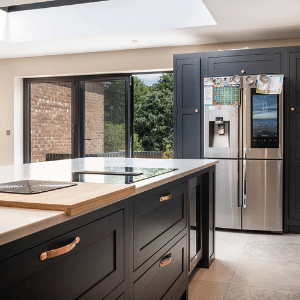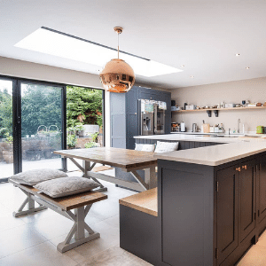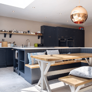Bespoke joinery and painted timber panelling around the island add tactile quality and architectural interest, demonstrating the project’s emphasis on high-quality materiality. A statement copper pendant light above the dining area introduces a sculptural focal point. Combined with discreet recessed ceiling lights, the layered lighting scheme balances ambience with practical illumination.