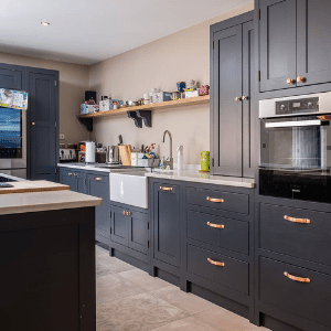 It features striking navy cabinetry and refined copper accents, a timeless colour palette which adds depth and sophistication, while keeping the space modern and inviting. The cabinetry extends floor to ceiling, maximising storage and creating a clean, cohesive visual rhythm. Dual built-in ovens and an integrated fridge streamline the workflow and give the kitchen a tailored appearance. The ceramic apron-front sink contributes to the classic-meets-contemporary aesthetic and solid wood dining bench and farmhouse-style table bring warmth to the open space.