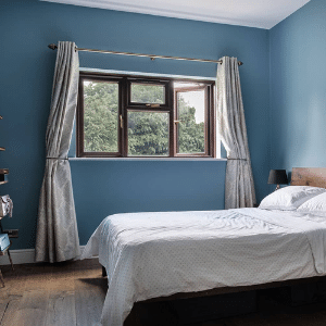The bedroom refurbishment creates a restful sanctuary through the use of cool blue wall tones. This enveloping colour choice promotes calmness and complements the greenery visible through the window. Large windows draw abundant natural light into the space while light-textured curtains soften the interior as well as maintain privacy and sense of tranquility.